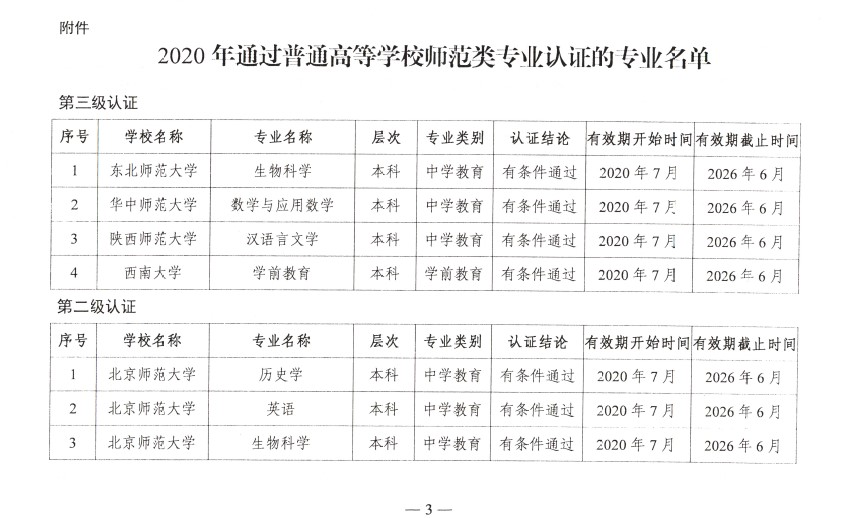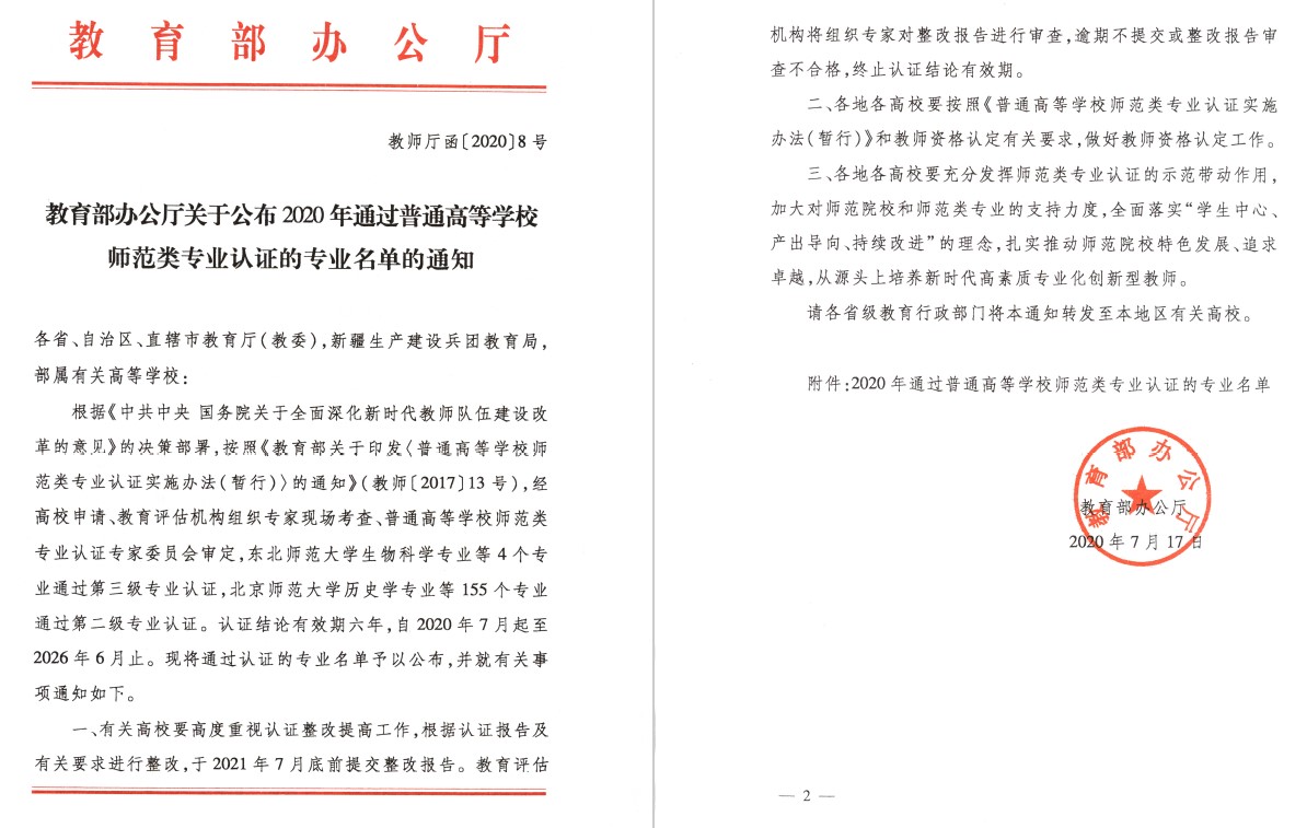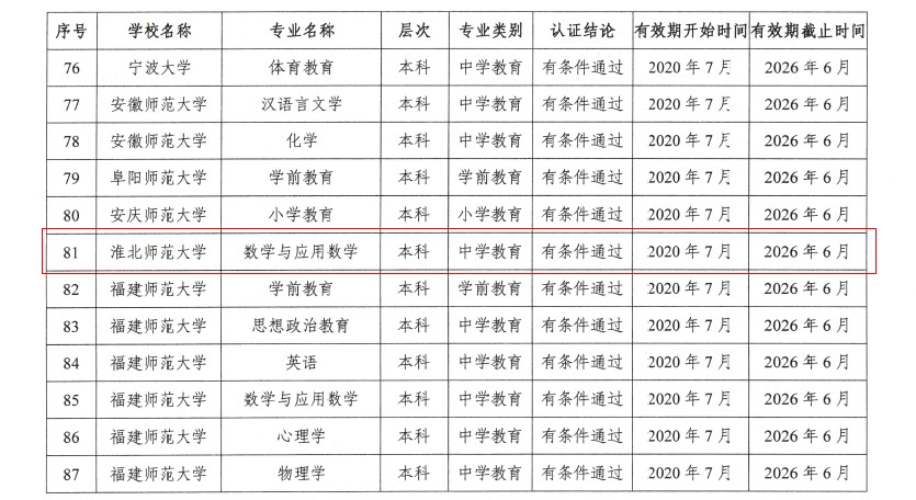 7月17日,教育部办公厅下发《关于公布2020年通过普通高等学校师范类专业认证的专业名单的通知》(教师厅函[2020]8号),海角网 数学与应用数学(师范)专业顺利通过中学教育第二级认证,有效期限为2020年7月至2026年6月,是安徽省首批通过的师范类专业第二级认证的5个专业之一,也是全省首个通过认证的数学与应用数学专业。